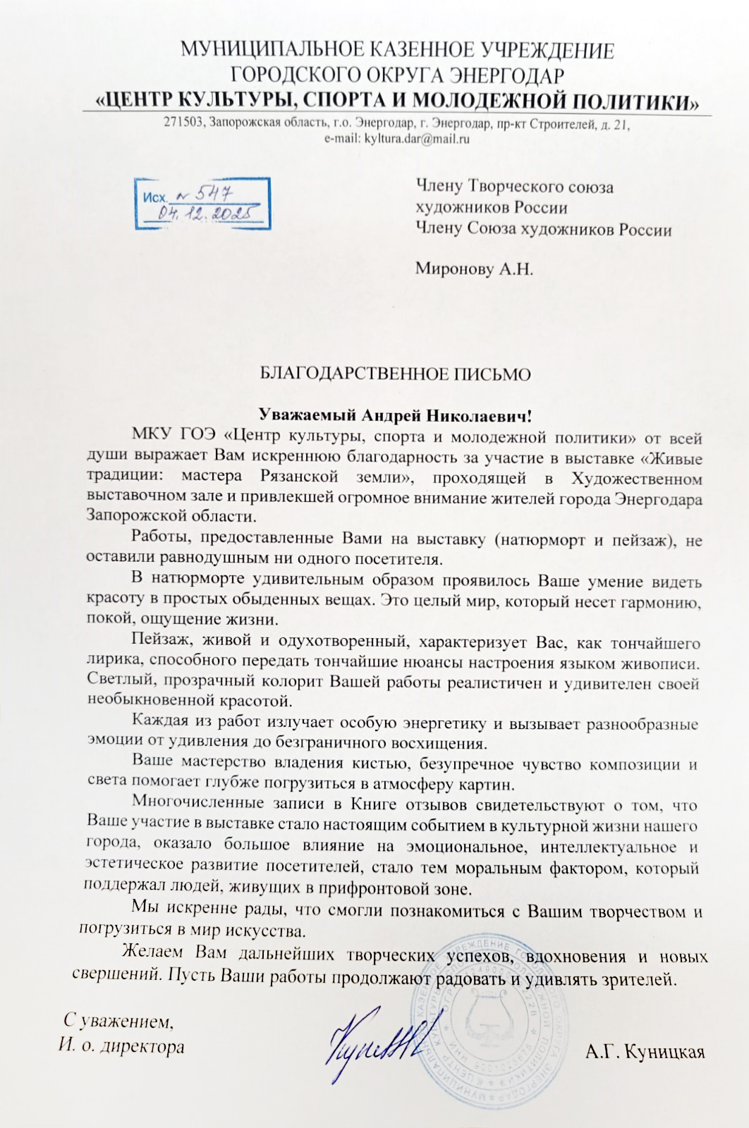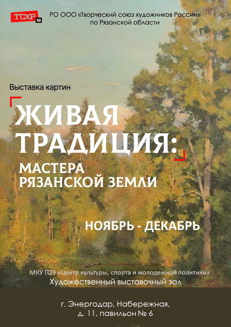 14 ноября 2025 года в Художественном выставочном зале МКУ ГОЭ «Центр культуры, спорта и молодёжной политики» (Запорожская область, г. Энергодар, Набережная, 11) открылась выставка живописи Рязанского регионального отделения ООО «Творческий союз художников России» «Живая традиция: мастера Рязанской земли», организованная по инициативе председателя регионального отделения Владимира Кривова, который уже несколько месяцев с товарищами по цеху занимается росписью главного храма города Энергодара — Свято-Богоявленского собора.